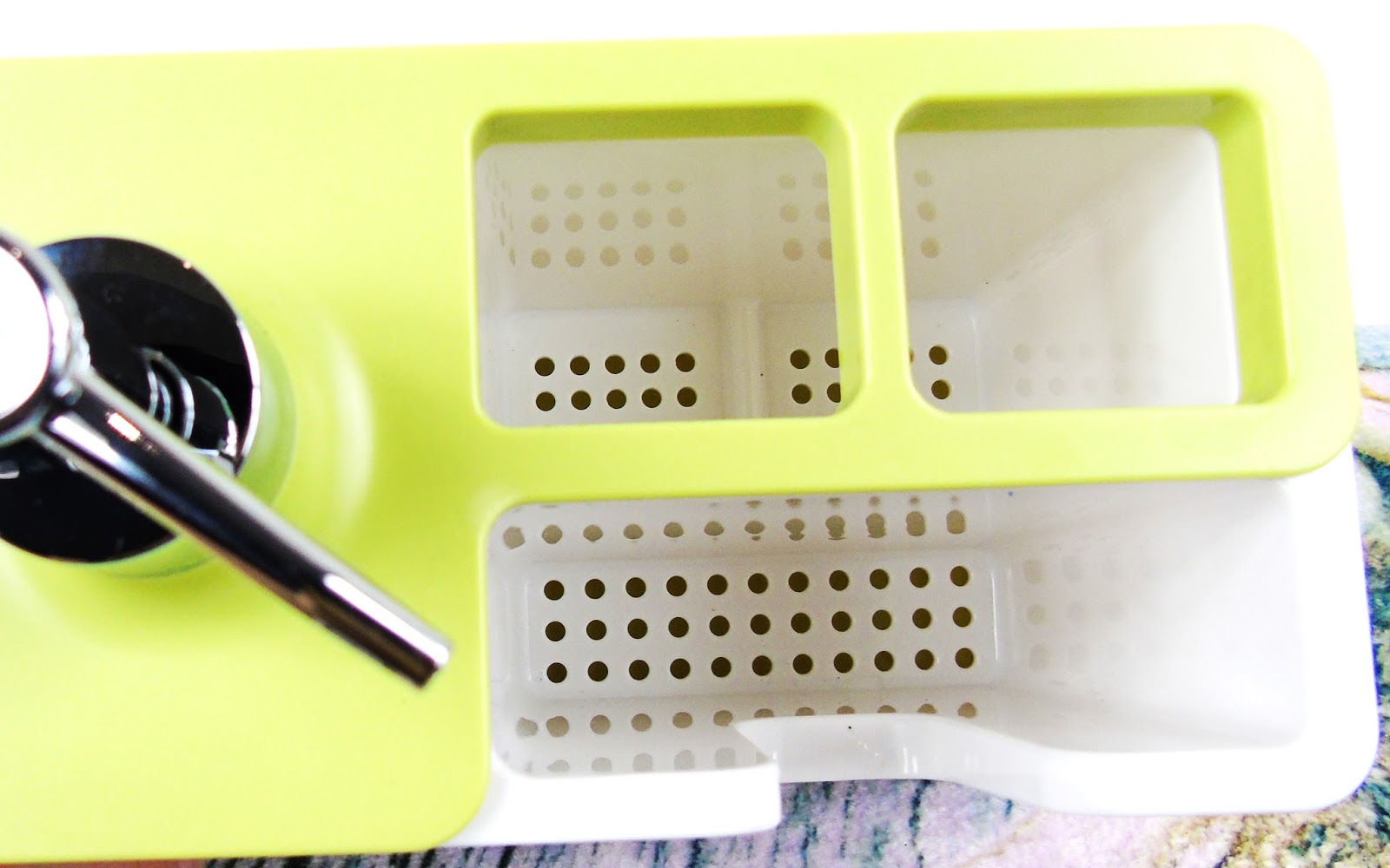 Kolejne cudeńko, które trafiło do mojego koszyka to organizer kuchenny z dozownikiem na płyn do naczyń, oraz ściereczki. Zaskoczył mnie jego wymiar, ponieważ spodziewałam się czegoś malusieńkiego a ten tutaj w rzeczywistości jest naprawdę duży. Zmieści minimum 0.5 litra płynu. Od spodu natomiast posiada on antypoślizgowe nóżki, dzięki czemu dobrze trzyma się blatu. Cieszę się, że go zamówiłam. Może kolor nie jest idealny, ale zastosowanie już tak.